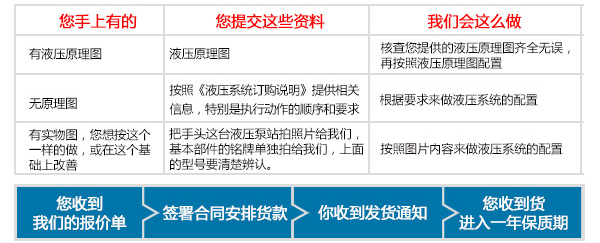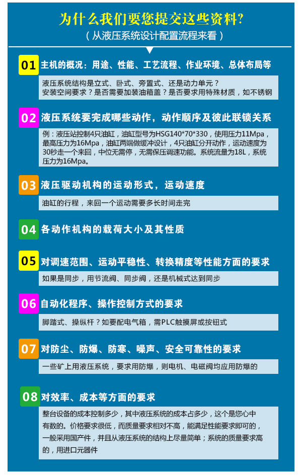 做一臺液壓系統(tǒng)需要客戶提供液壓要達(dá)到什么樣的功能要求。液壓系統(tǒng)的整個工作過程。比如一共有幾個油缸或馬達(dá),每個油缸需要達(dá)到多少推力,每個油缸的速度是多少是否有變化,以及每個油缸的負(fù)載情況。多個油缸時,是否有同時工作或同步要求。(是否變化、還需要提供工作時間、工作環(huán)境)