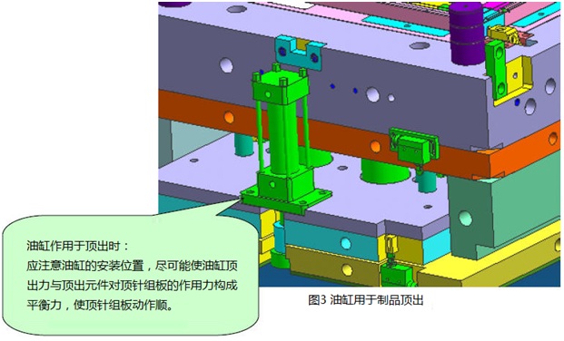 在此類應用中,應注意油缸的安裝位置,盡可能使油缸頂出力與頂出元件對頂針組板的作用力構成平衡力系,減少頂針組板動推板導柱的傾覆力,使頂針組板動作順。