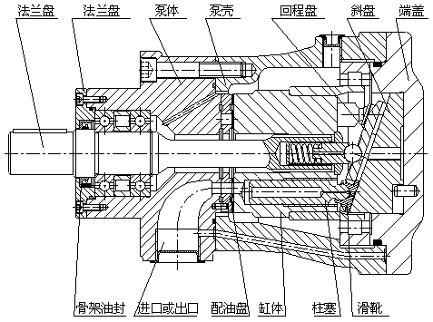 軸向柱塞泵是采用配油盤配油,缸體旋轉,靠變量頭變量的斜盤式軸向柱塞泵。該泵采用液壓靜力平衡的最佳油膜厚度設計,使缸體與配油盤、滑靴與變量頭之間處于純液體摩擦下運轉,具有結構簡單、體積小、噪音低、效率高、壽命長和有自吸能力等優點。