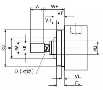 ■活塞桿端尺寸:定位臺階RD、活塞桿直徑NA、螺紋尺寸KK、突出的桿長尺寸,見下圖所示。